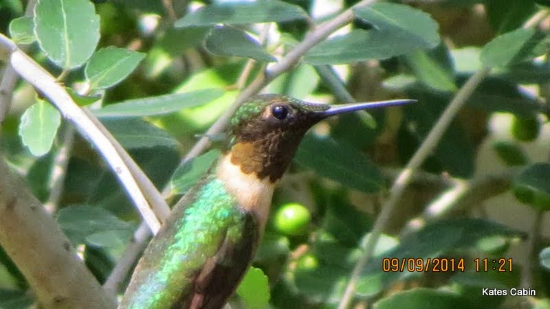 Look who I found in top of a tall tree, basking in the morning sunbeams! They are usually difficult to see this high up, but this one was moving and puffing up his feathers for an air bath. In the photos below of 9 9 E, you will see the birds in their natural environment (the trees). This big old oak tree is in my front yard hanging over Kates Cabin. Due to all the shade, it takes longer for the sun to stream down to ground level, so it is normal to see the birds fly up to meet the sun on cool mornings. I just get to sit here and take it all in! Enjoy!