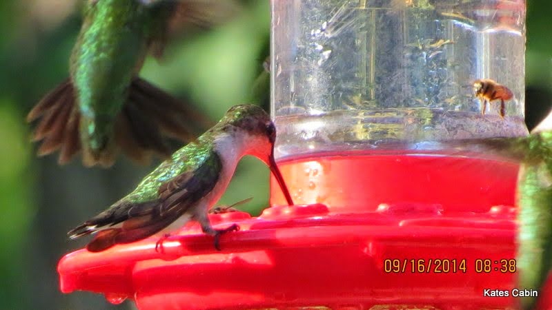 "Sleigh Bells ring, are you listening? In the lane, snow is glistening......" I actually have never seen a sleigh or heard the bells as there has never been (measurable) snow, so no winter wonderland here. However, I have plenty of Holiday Spirit, Texas hot sunshine and lots of hummingbird tails to warm your heart in your snowy places. Today we are looking at the highlights of 9 16B. A crisp, sunny morning as the tiny guests are well into their regular routine of visiting the feeders with the friendly bees. I hope you can feel the happiness of the flying jewels. Enjoy!