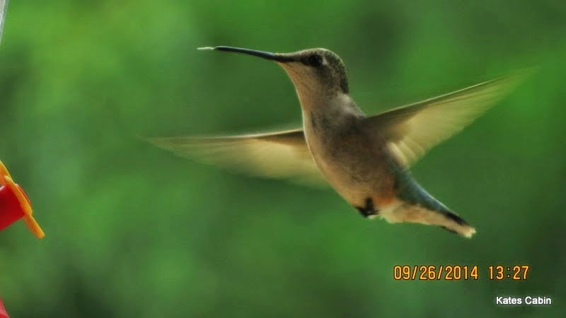 The birds know the location of every feeder they visit and return each year looking for the food source. Over time, the hummers began to stay longer at my Mom's feeders from days until months. After Mom left, I built a wildlife habitat at my small place, which is 2 miles from Mom's farm. I do not know how 'Mom's herd of hummers' found me, but they did and have been coming here for 10 years now. Of course, I think Mom guided them here. Anyway, more and more come each year, with over 400 observed at the peak in 2014. Four years of drought in the area killed many wild flowers on the route. The feeders saved the birds along with people who plant flowers for these birds. People protecting wildlife and learning to live with them, is the growing trend. Unfortunately, even in these enlightened times, many people kill wildlife and birds for sport or money. My objective was to build a safe sanctuary for the birds, photograph and share them with the world. I am documenting in real time, a real event of the hummingbirds choosing to make Kates Cabin an official gathering spot each year! Any other buzz you hear around here is from the bees! Enjoy!